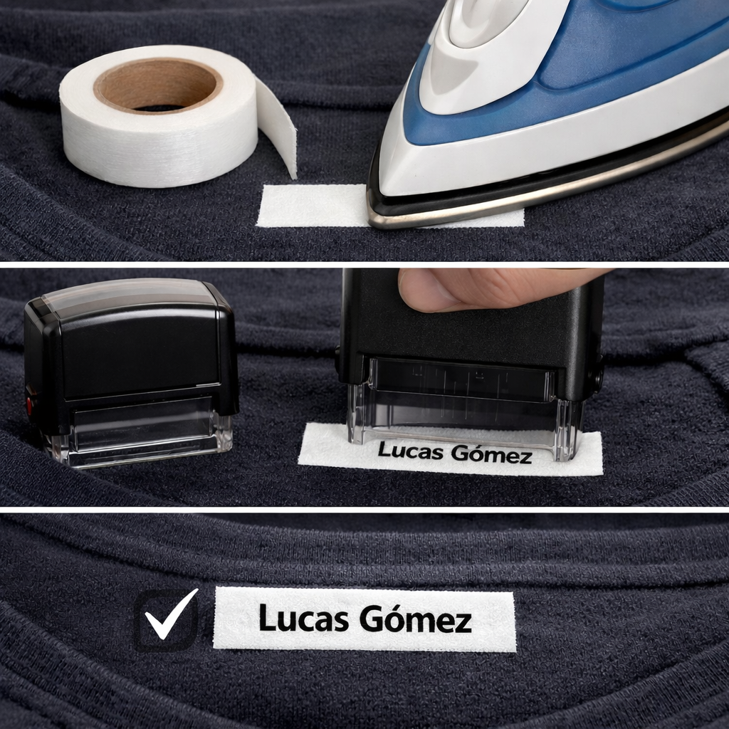 Por este motivo, muchas familias utilizan sellos para marcar ropa, pero en prendas oscuras necesitan un pequeño complemento: una cinta textil blanca donde estampar el sello.